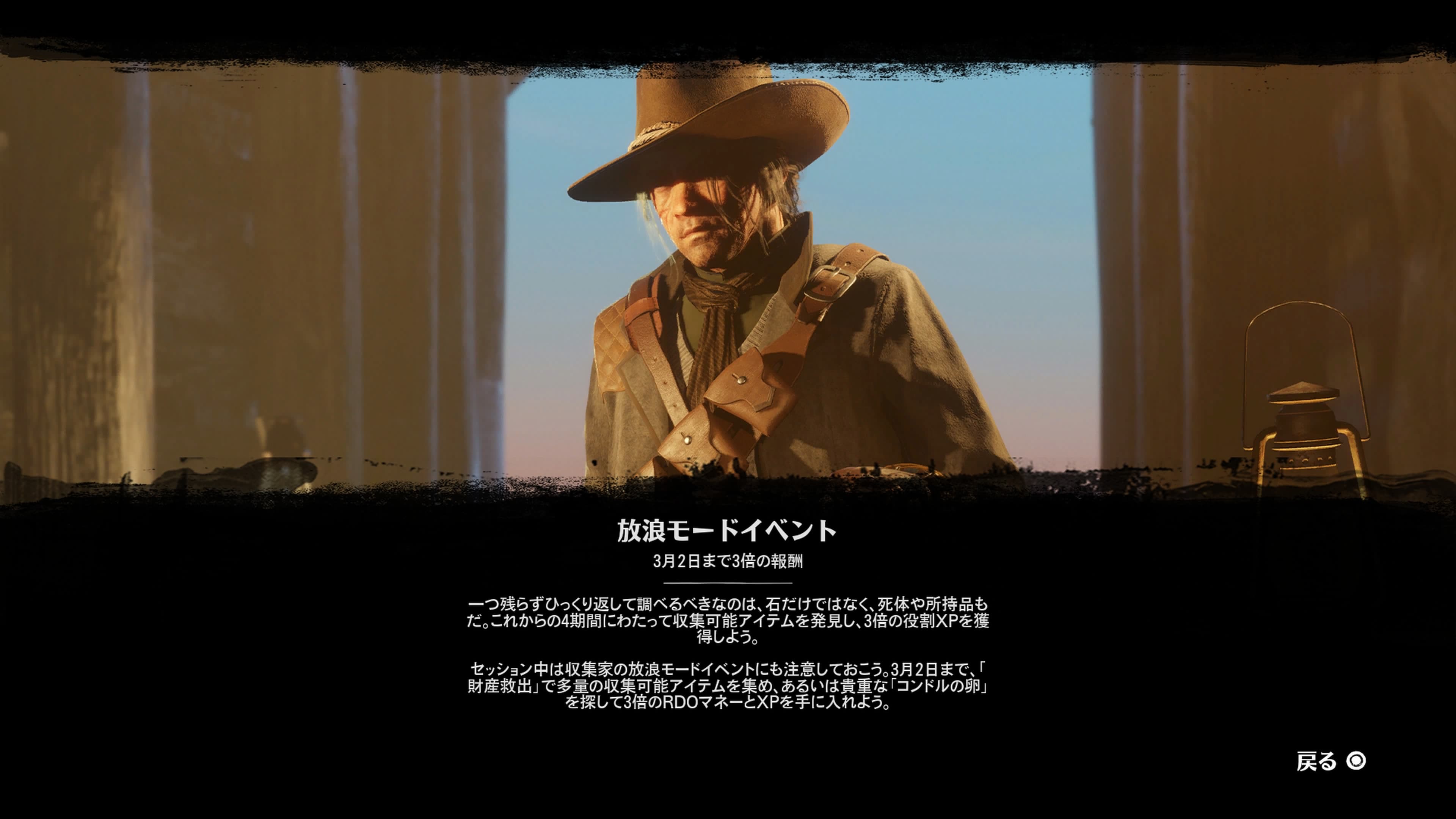 また、収集アイテムを発見すると役割XPが3倍、放浪イベント「財産救出」「コンドルの卵」ではRDOマネー、XPが3倍になります。